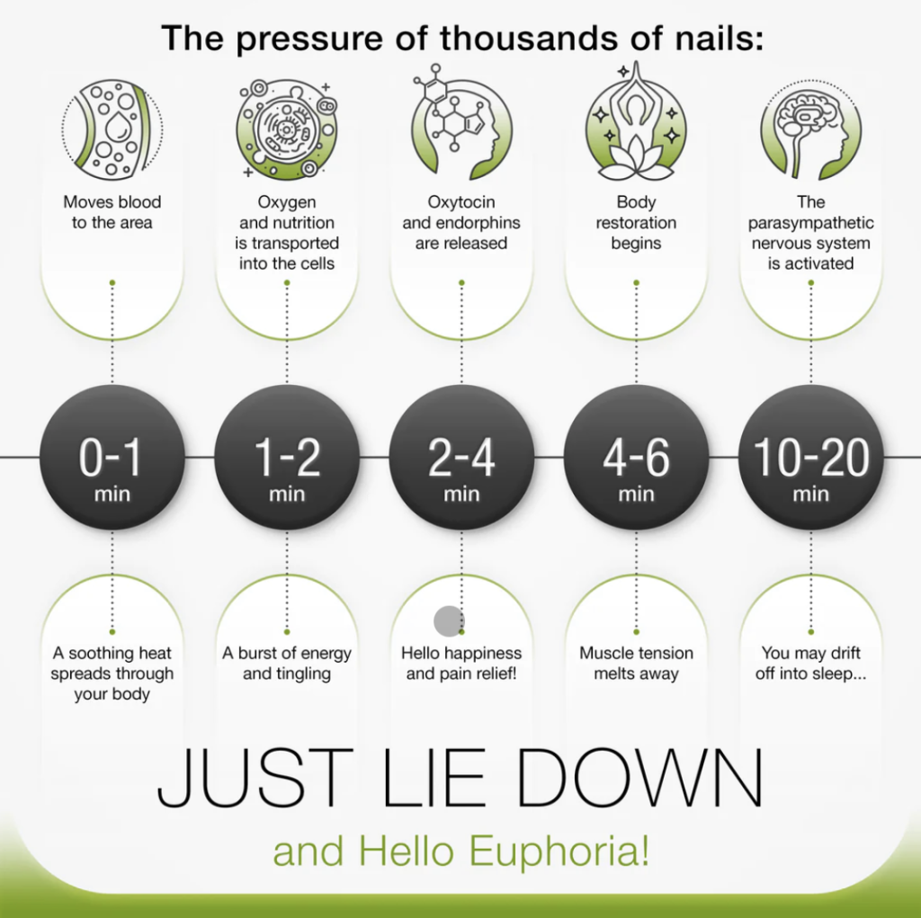But let's delve a bit deeper into what makes the BON ECO Mat so special. Adorning its surface are 8,820 precision acupressure nails. Although they might sound intimidating, these nails, made of non-toxic recyclable plastic, are designed to gently exert pressure against your skin, much like acupuncture. The experience is truly unique. For some, it evokes a euphoric sensation, a burst of energy, thanks to the release of endorphins, while others might find themselves in a state of serene relaxation courtesy of oxytocin. The best part? These effects can vary each time you lay on the mat. One day you might find clarity of mind, and another day, sheer bliss.