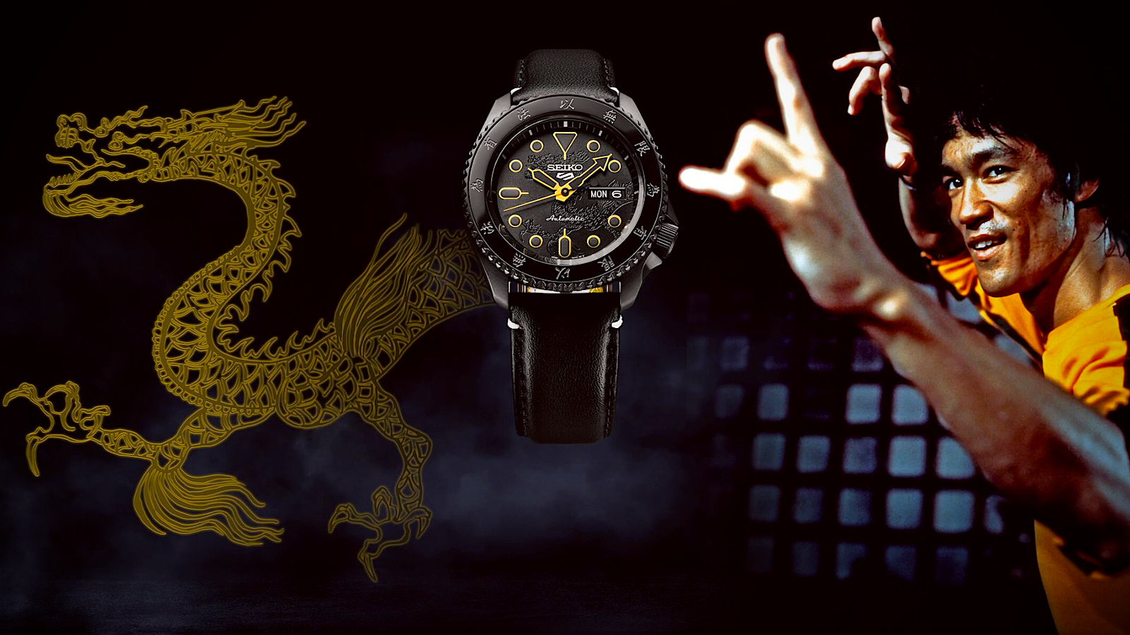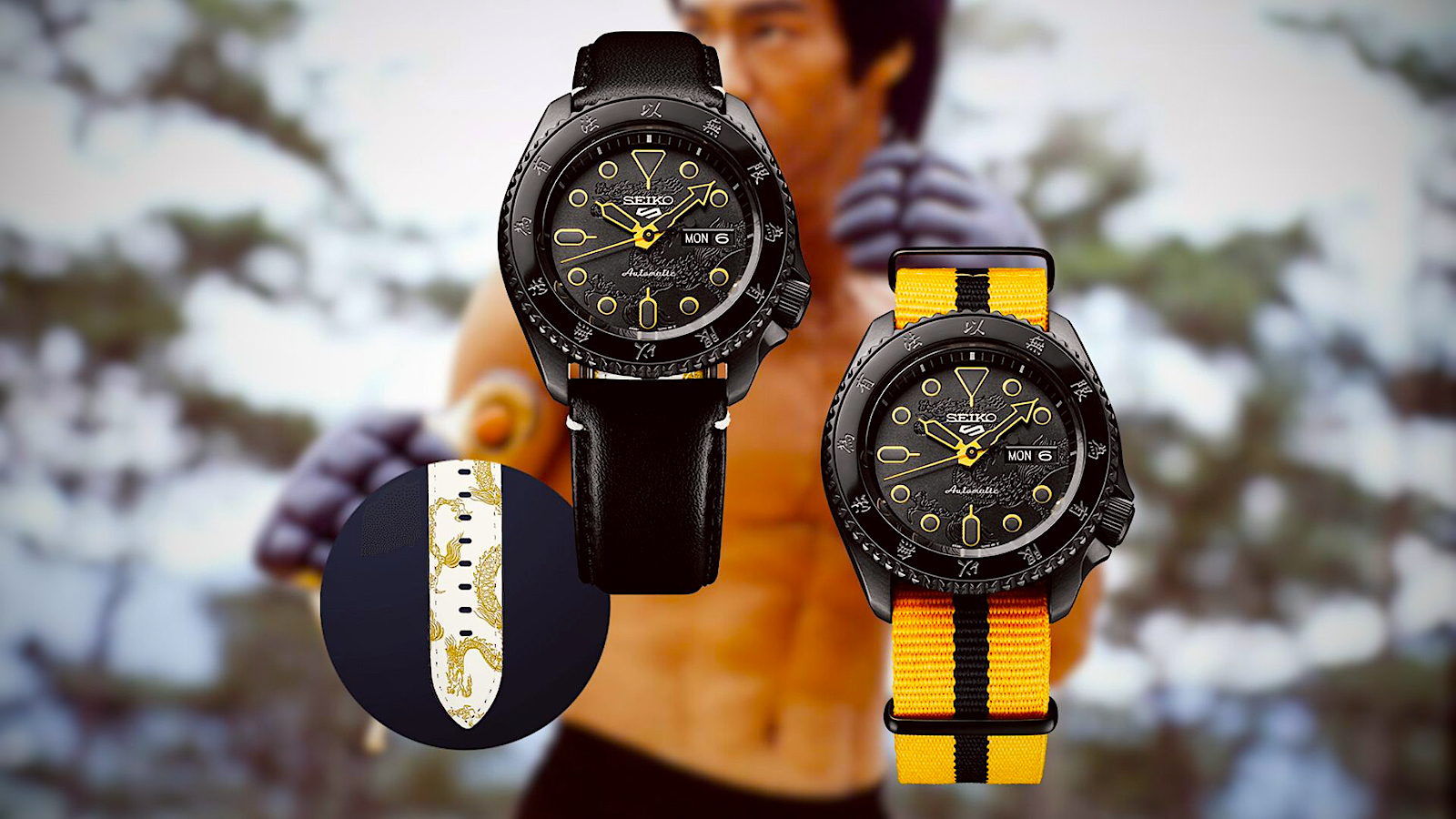 The straps offer a narrative of their own, speaking volumes without uttering a word. The black leather strap, with its subtle dragon design on the inside, is a gentle nod to the attire often associated with Kung Fu, encapsulating the grace and strength the art form demands and that Lee so effortlessly displayed. Accompanying it, a nylon strap mirrors the iconic yellow tracksuit Lee donned, immortalizing him further in the annals of pop culture.